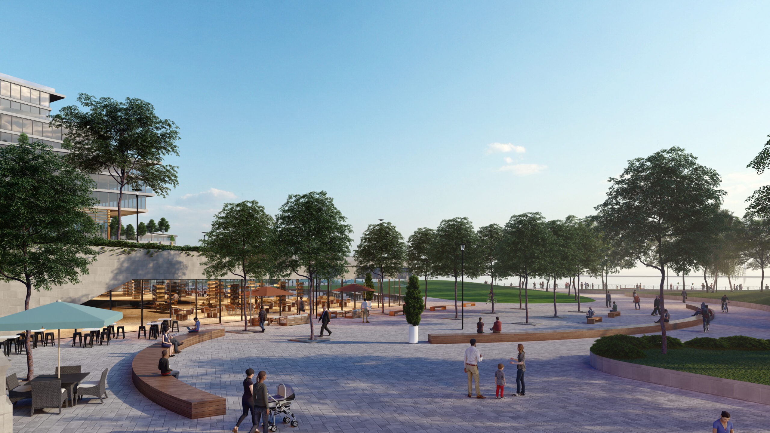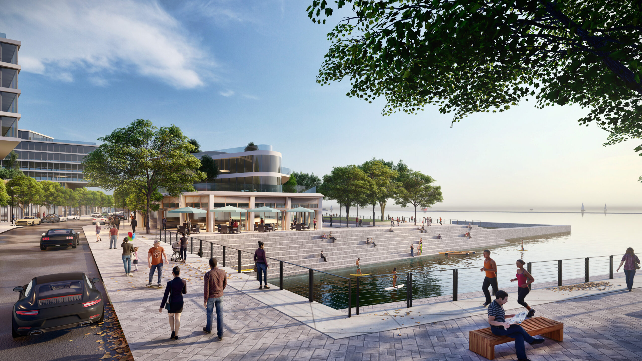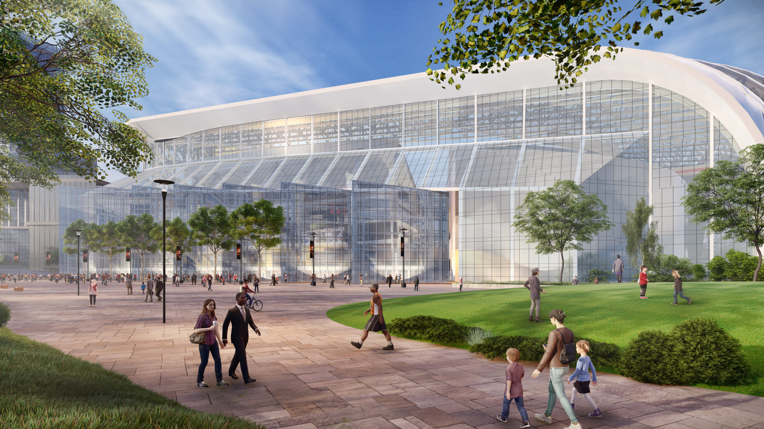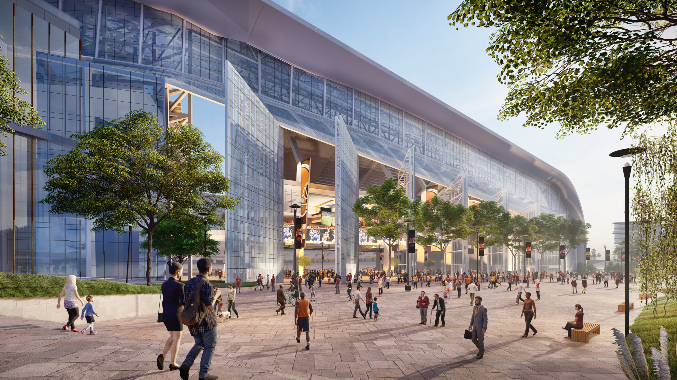 This concept also envisions the stadium being encompassed by a new shell and partial roof, incorporating new fan amenities, spectator seating, food service and retail opportunities, circulation areas, and back-of-house facilities within this scheme. The Stadium also opens up to provide the optimum experience of the downtown arcade and waterfront.